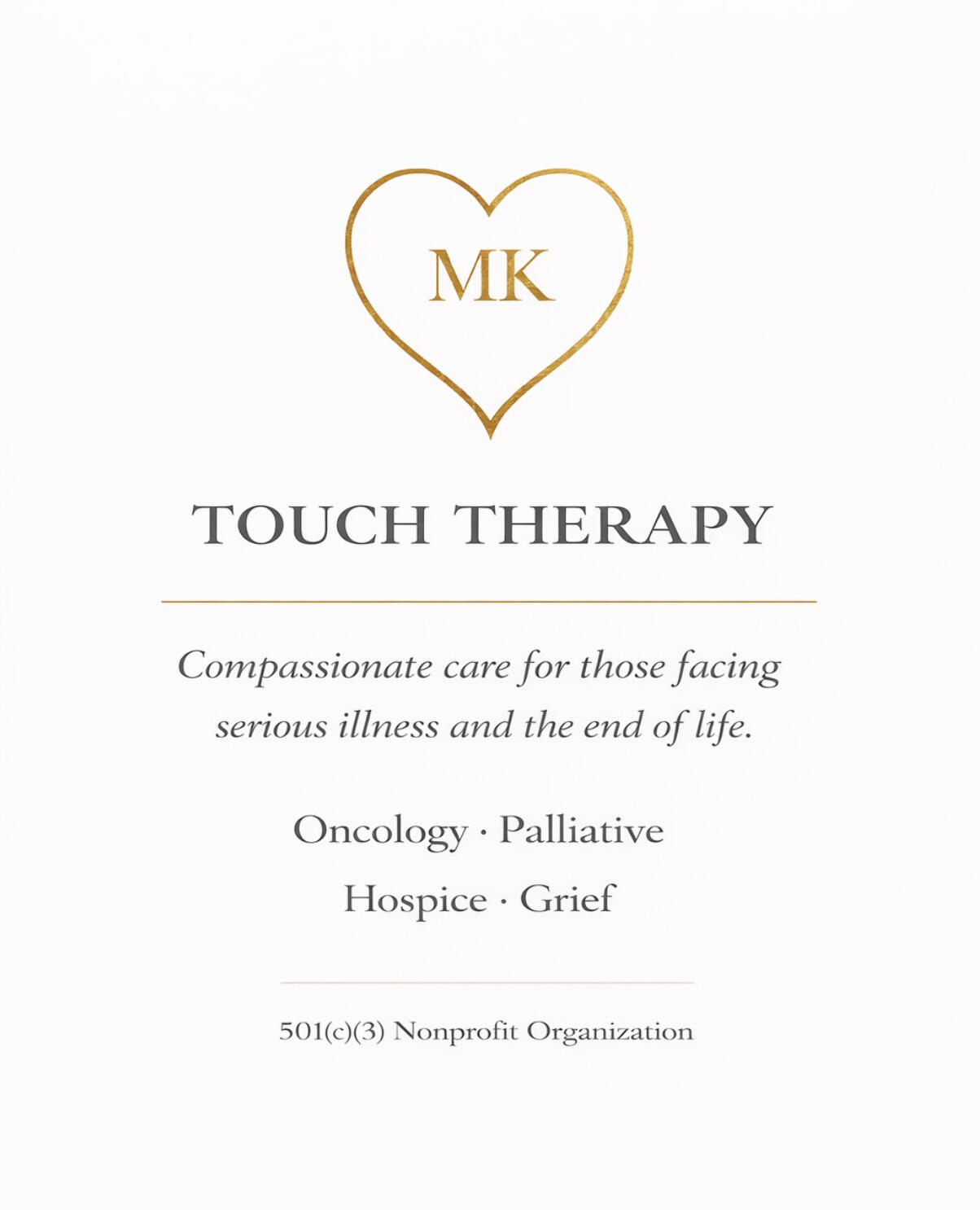 Thank you for your interest in my work and the care I offer. I am a licensed Massage Therapist with specialized training and certification in compassionate massage and therapeutic touch for adults and children navigating cancer treatment or remission, as well as individuals approaching the end of life in palliative or hospice care.This work is deeply sacred to me. Every session is guided by intention, presence, and respect—offering a gentle pause in a world that can feel overwhelming, uncomfortable, or rushed. Through mindful touch, I create a safe and nurturing space where clients are invited to rest, soften, and reconnect with themselves. In this space, touch becomes a quiet companion—supporting peace, comfort, and a deeper sense of wholeness as each person honors their own unique journey.*****If you’re curious or seeking clarity, the FAQ offers thoughtful answers to the questions clients most often ask about massage and touch therapy in this capacity.Explore ABOUT to learn more about the heart, intention, and philosophy that guides this practice.Visit MEET YOUR THERAPIST to learn more about my background, training, and credentials.
